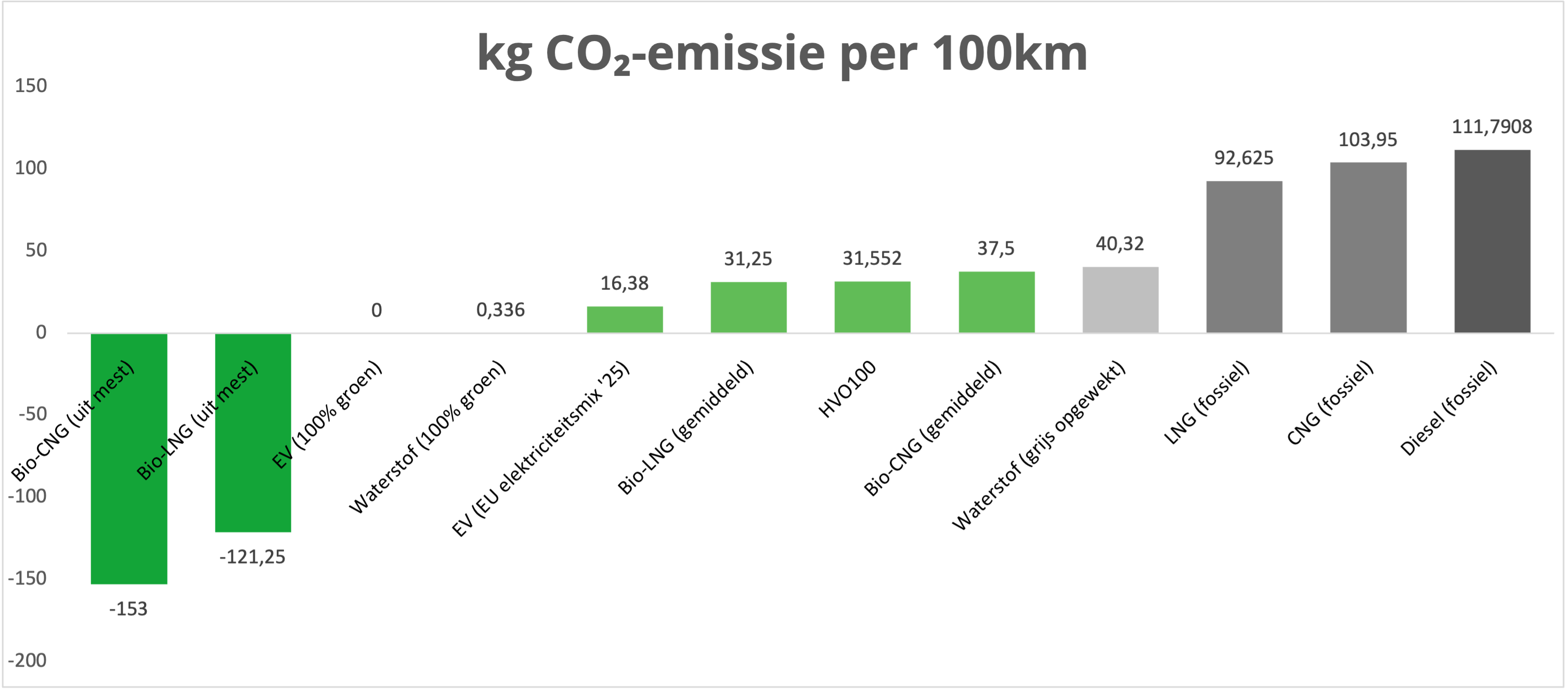 Afhankelijk van de grondstof kan een brandstof zelfs een negatieve uitstoot opleveren. Dit gebeurt bij Bio-CNG uit mest aan de kant van de productie: door mest te vergisten vang je ook schadelijke emissiestoffen af die anders de vrije lucht in zou gaan.